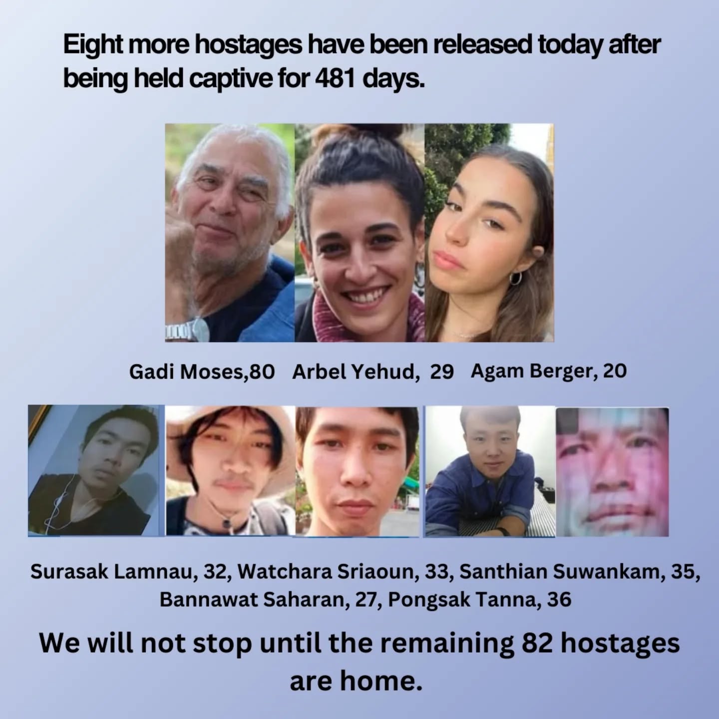 Today 8 hostages were freed from captivity. 82 hostages still remain.