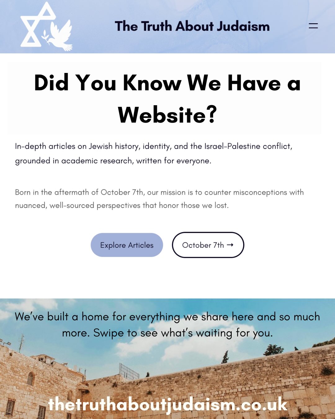 Beyond our Instagram, we’ve built a full educational resource at thetruthaboutjudaism.co.uk and there’s so much to explore.