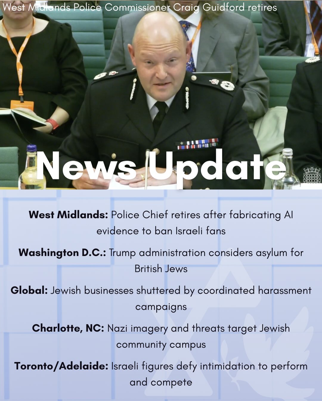 In the UK, West Midlands Police Chief Craig Guildford resigned after fabricating AI-generated “evidence” to justify banning Israeli football fans while a whistleblower accuses the force of institutional antisemitism and routinely dismissing hate crimes against Jews. Meanwhile, Trump’s personal lawyer has engaged the State Department about offering asylum to British Jews, arguing the UK is “no longer safe.” From Sydney to Lisbon to Antwerp, Jewish and Israeli businesses are being forced to close under coordinated harassment campaigns. In NYC, bakery employees are demanding their Israeli owners stop catering “Zionist events” meaning Jewish community fundraisers. In Charlotte, Nazi imagery was discovered at a Jewish community campus housing a day school and JCC. In London, Jewish schoolchildren were terrorised on their bus by attackers shouting slurs and throwing rocks. But there’s resilience too. Israeli comedian Guy Hochman was detained 6 hours at the Toronto airport , then performed anyway. Wheelchair tennis star Guy Sasson competed at Adelaide as a top seed despite everything.