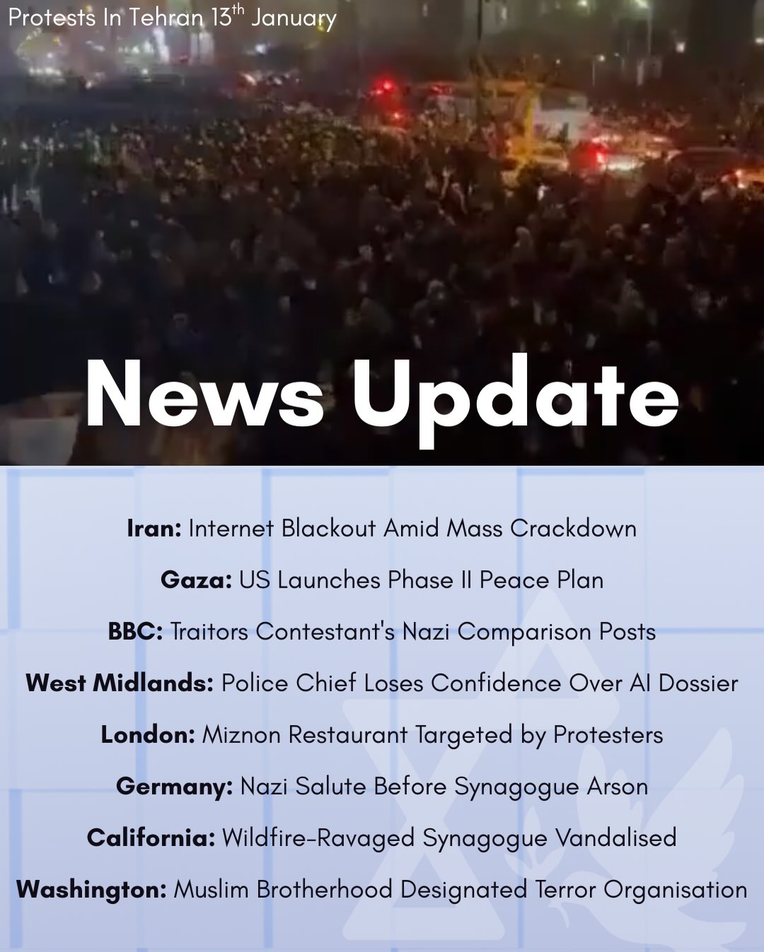 This week’s update covers major developments across the Middle East, UK, and beyond. The Trump administration has launched Phase II of the Gaza peace plan, establishing a technocratic Palestinian administration and beginning demilitarisation efforts. Iran is under a near-total internet blackout as the regime intensifies its violent crackdown on protesters. Human rights groups report thousands killed. The BBC apologised after a Traitors contestant’s posts comparing Israel to Nazi Germany were missed in vetting. Meanwhile, Home Secretary Mahmood declared she has “no confidence” in West Midlands’ Chief Constable after AI-fabricated evidence was used to ban Maccabi Tel Aviv fans.