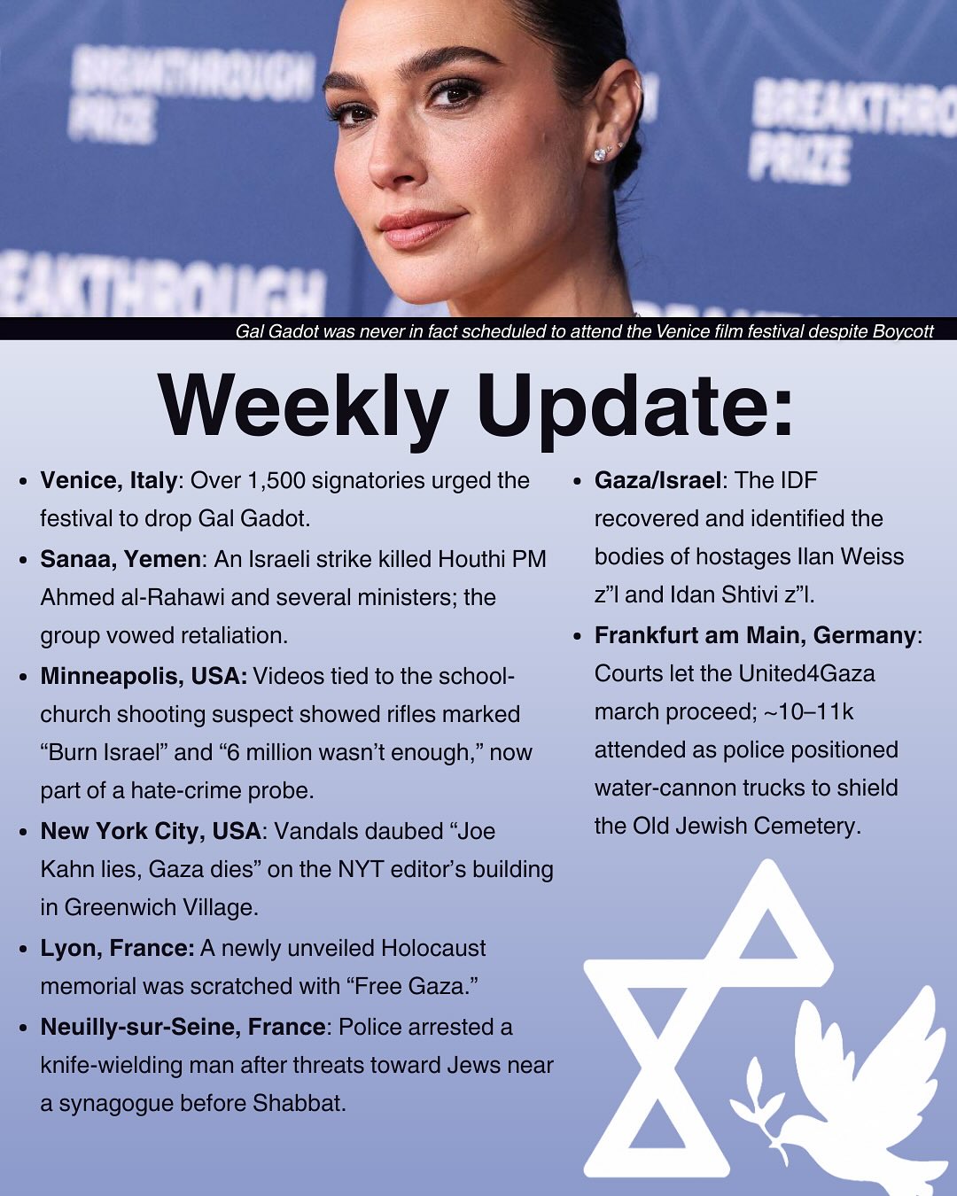 Jewish culture and acceptance in the public space also came under pressure: a petition urged the Venice film festival to drop Gal Gadot, even though she was never slated to attend, proof that a false story can still fuel real hostility against Jews.