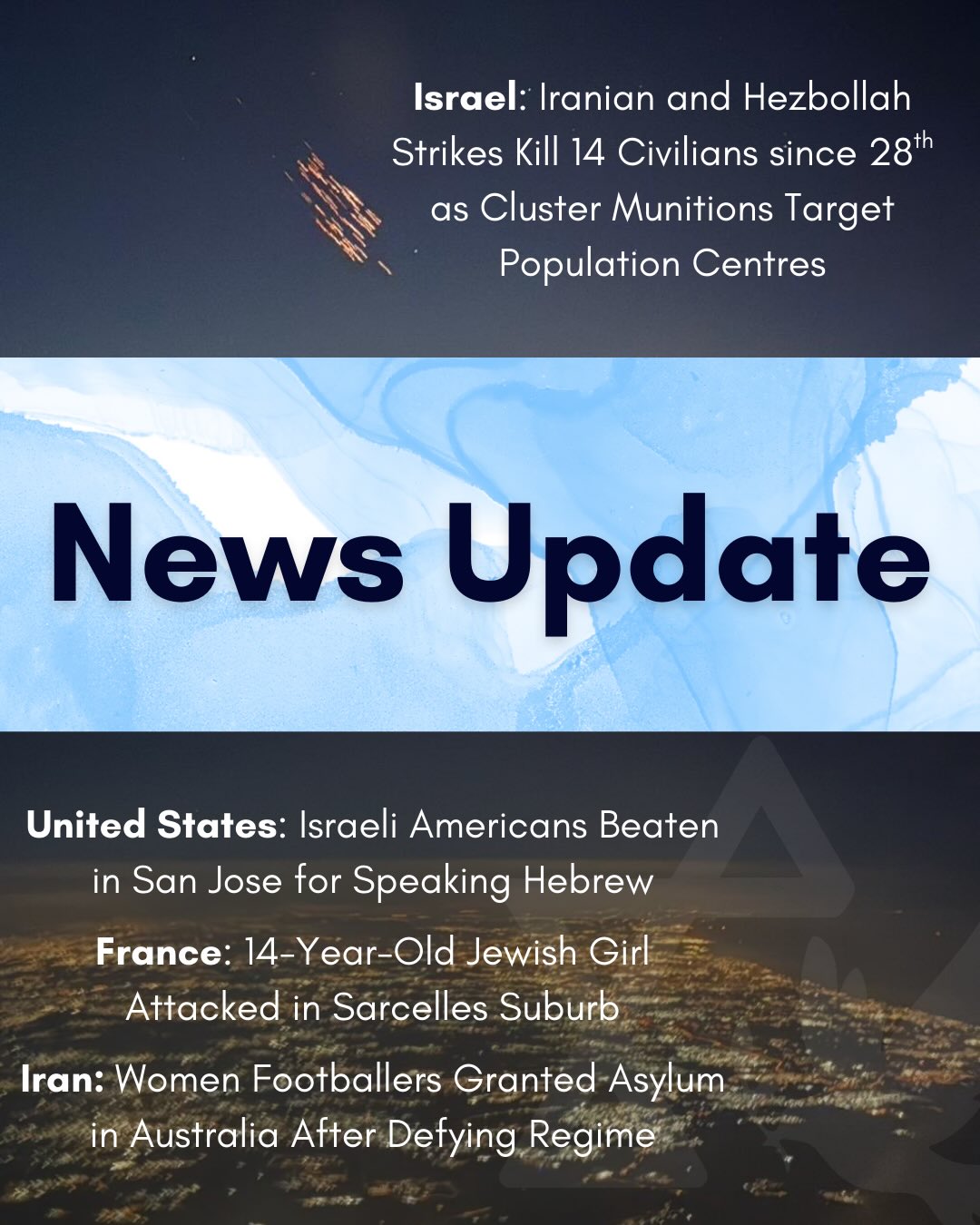Weekly Update 12 March 2026, Iran has killed 14 civilians in Israel in two weeks, including three teenage siblings sheltering in a Beit Shemesh synagogue and a Filipina caregiver who died saving her patient. Half of Tehran’s 300 missiles carried cluster bomb warheads. Hezbollah has simultaneously launched over 100 rockets into northern Israel.