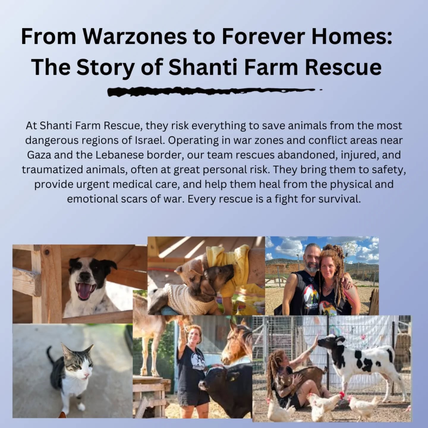 Shanti Farm Rescue in Atlit, Israel, has saved hundreds of animals since the war began—dogs, cats, cows, goats, even pigs. These animals were abandoned, injured, and traumatized, often found near Gaza or the Lebanese border. Without Shanti, they wouldn’t have survived.