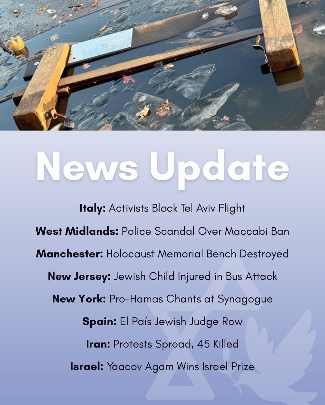 In Milan, pro-Palestinian activists physically blocked passengers from boarding a Tel Aviv flight. In the UK, West Midlands Police face accusations of fabricating evidence to justify banning Maccabi Tel Aviv fans, while a Holocaust survivor’s memorial was destroyed in Manchester. In the US, an 8-year-old Jewish girl suffered a fractured skull when a rock was thrown at her school bus in New Jersey, protesters chanted support for Hamas outside a Queens synagogue, and Spain’s El País apologised for questioning a Jewish judge’s impartiality.